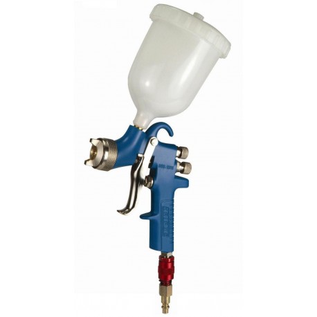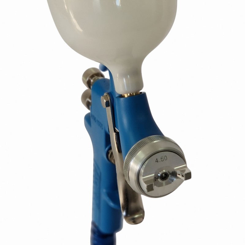 Pistola para un perfecto acabado en gravedad, apropiada para toda clase de esmaltes sintéticos, nitró celulósicos, barnices, lacas, carteles arrugables, etc.
