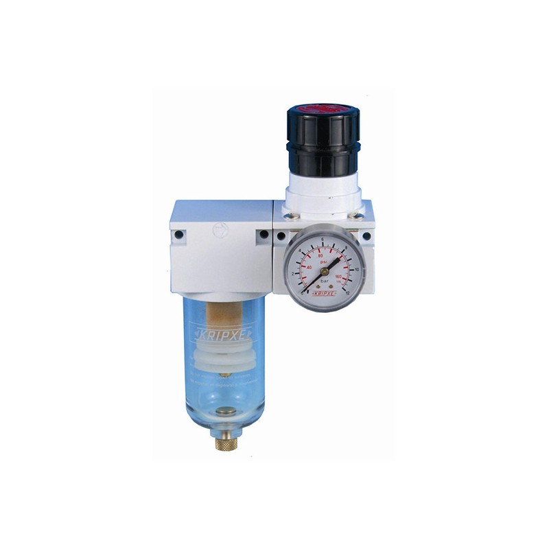 Regulador + filtro para instalaciones neumáticas. Regula la presión de aire de trabajo. Elimina las impurezas y la humedad del aire comprimido.