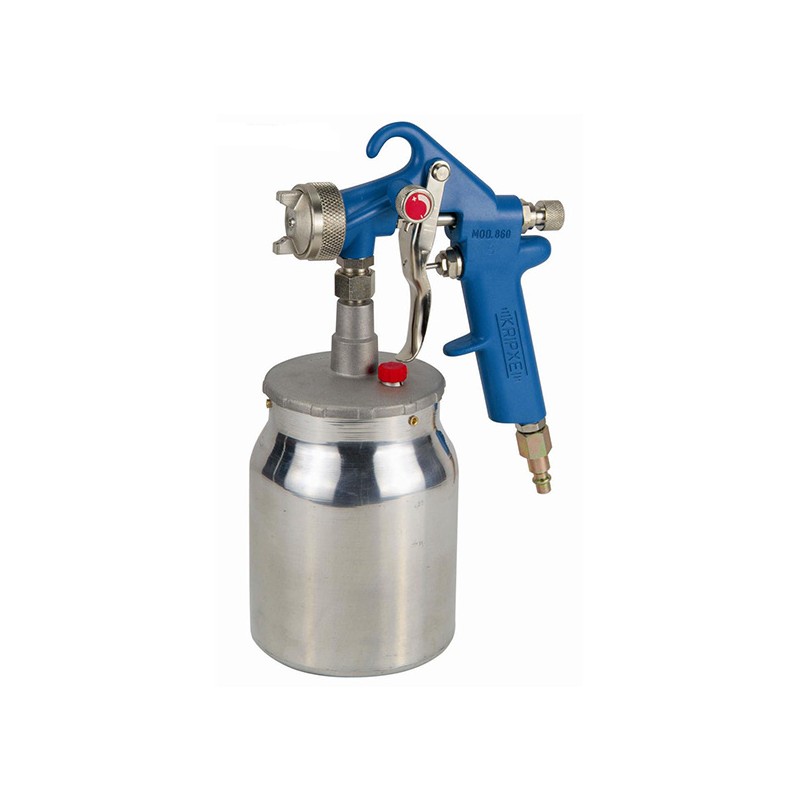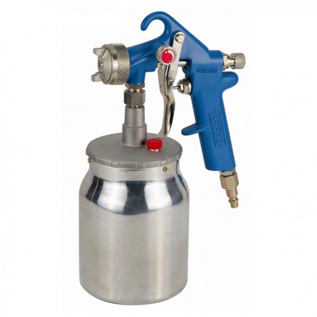 Pistola por succión ideal por su gran producción y bajo coste, apropiada para pinturas sintéticas, nitrocelulosicas, esmaltes, marteles , tintes, etc… especial para bricolaje.