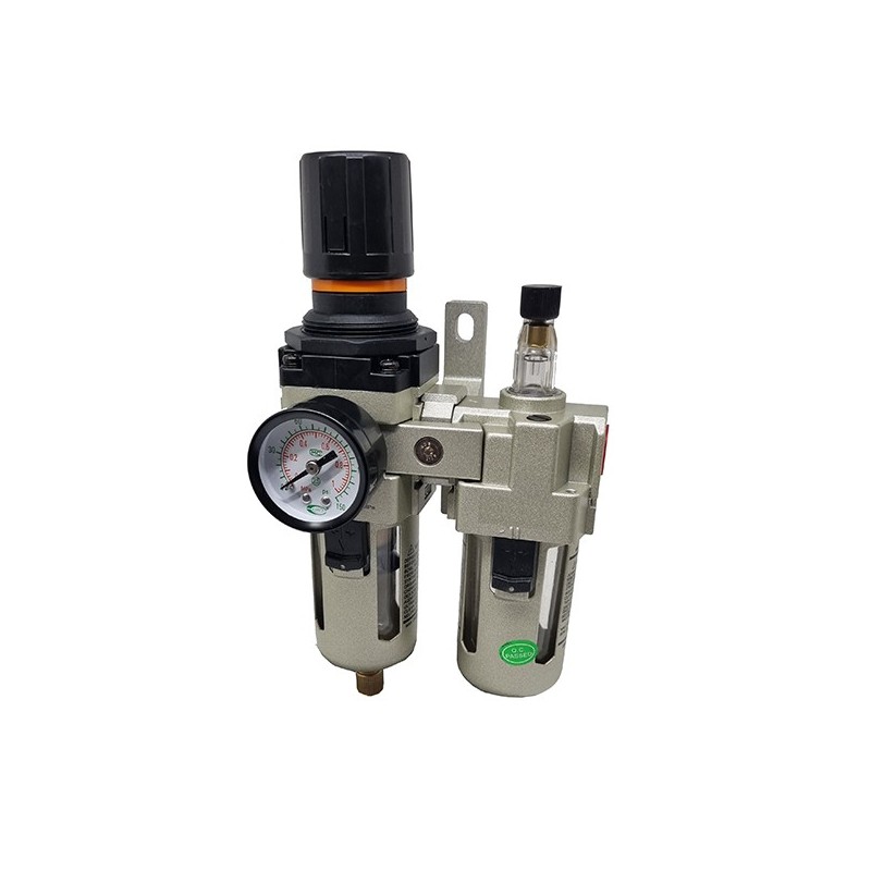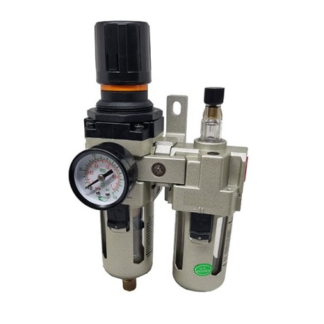 Regulador + filtro + lubricador para instalaciones neumáticas. Regula la presión de aire y la cantidad de aceite con la que se quiere que trabaje, además elimina las impurezas y la humedad del aire comprimido.
