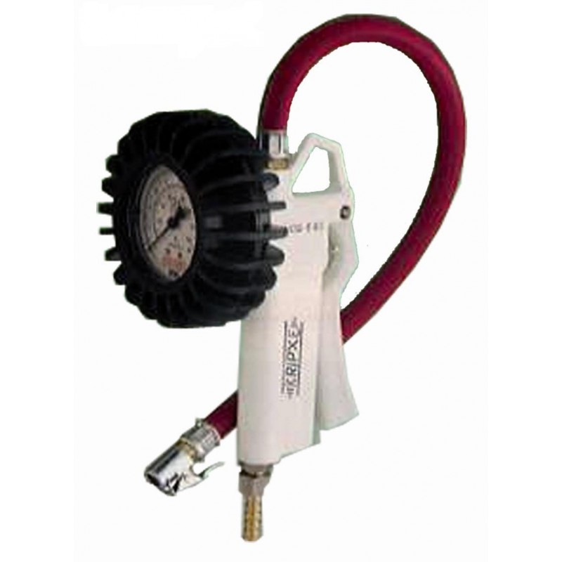 Pistola infladora de máxima precisión con nuevo sistema de tres válvulas en triangulo. Sistema diseñado expresamente para que la entrada de aire sea paulatina y sin cambios bruscos evitando oscilaciones innecesarias de la aguja indicadora del manómetro.